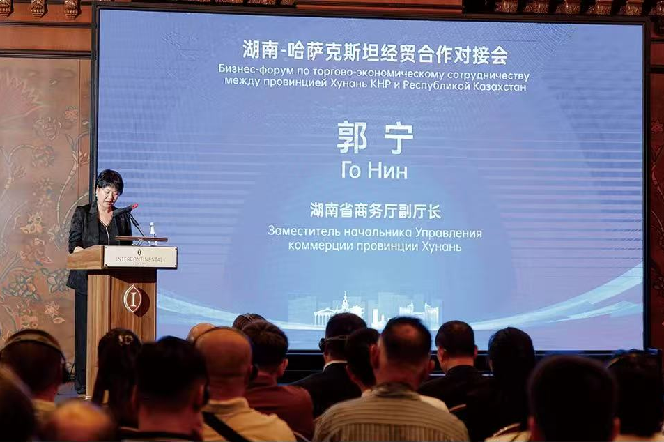 ▲郭寧副廳長在致辭中介紹,湖南區(qū)位優(yōu)越、產(chǎn)業(yè)基礎(chǔ)扎實。她強調(diào),哈薩克斯坦是湖南對外開放合作重點區(qū)域,2024年湘哈進(jìn)出口額達(dá)7.5億美元,同比增長36.2%。(圖片轉(zhuǎn)載自公眾號@湖南省對外經(jīng)濟(jì)合作企業(yè)協(xié)會)